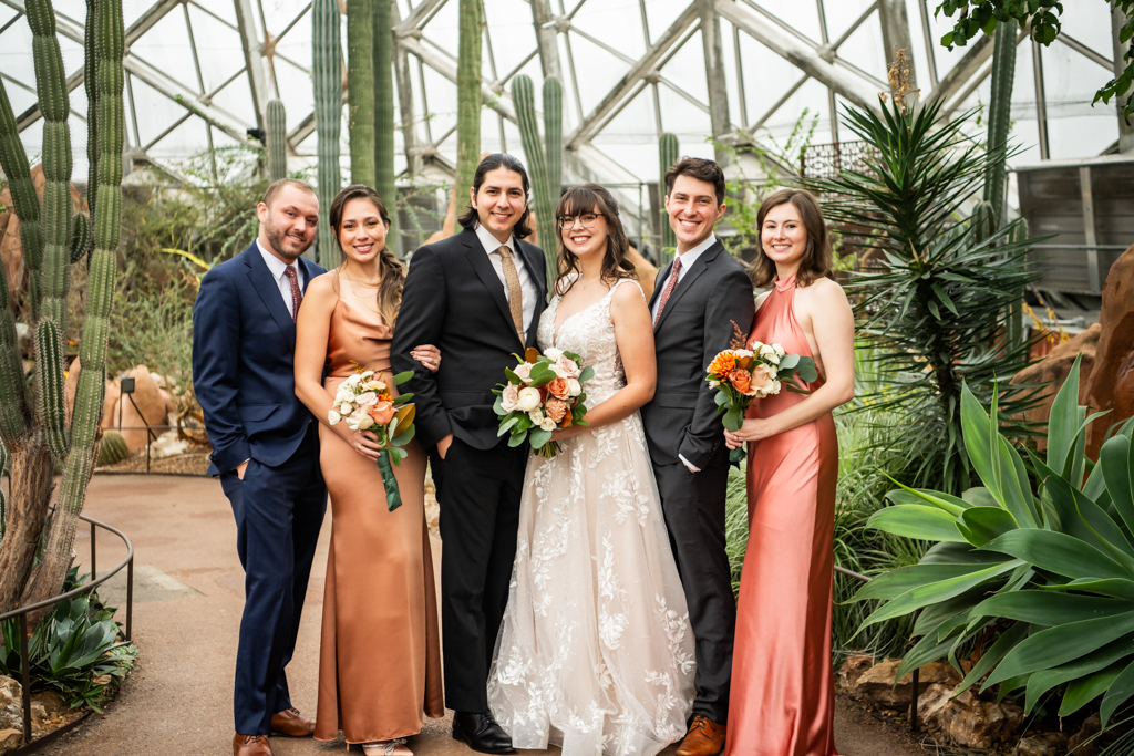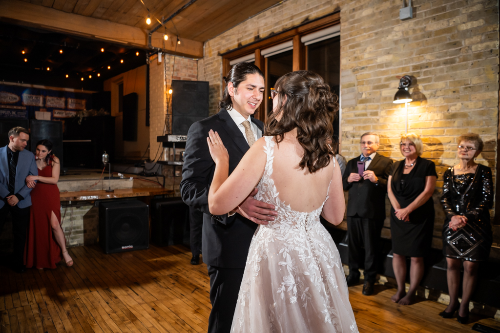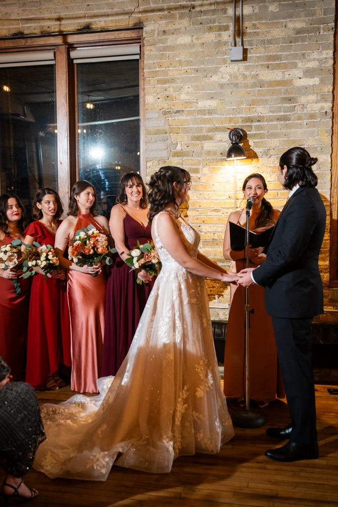 The couple shared a private First Look before the ceremony, allowing us to capture some beautiful, intimate moments early on. We took advantage of the soft winter light and made our first photo stop at the stunning Federal Building in downtown Milwaukee. From there, we headed to Mitchell Park, The Domes—a unique and vibrant spot that provided the perfect backdrop for the wedding party and family portraits. Their celebration continued at Anodyne Coffee Roasting Co. in downtown Milwaukee, a warm and inviting venue that suited the couple’s laid-back, earthy style.